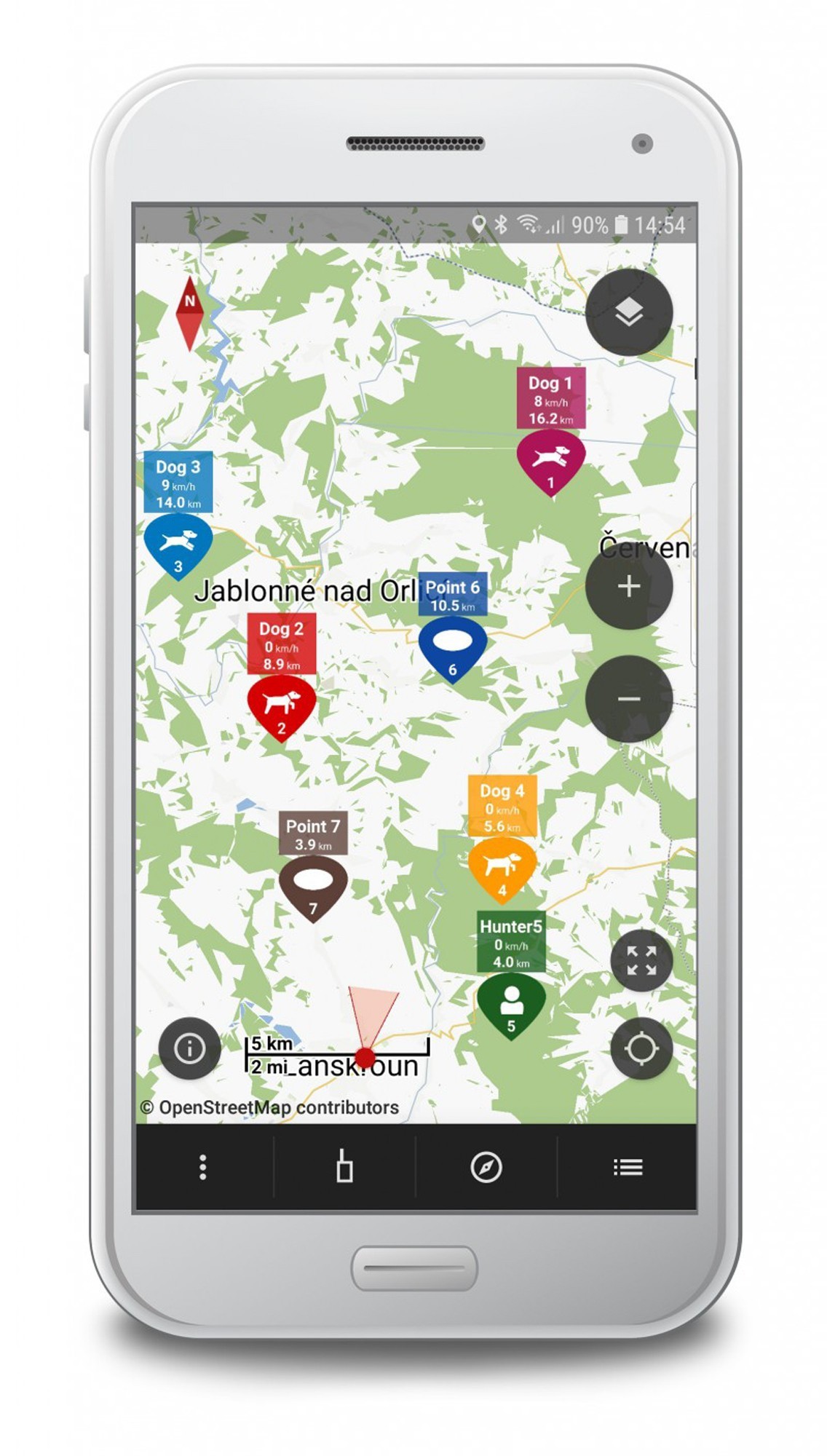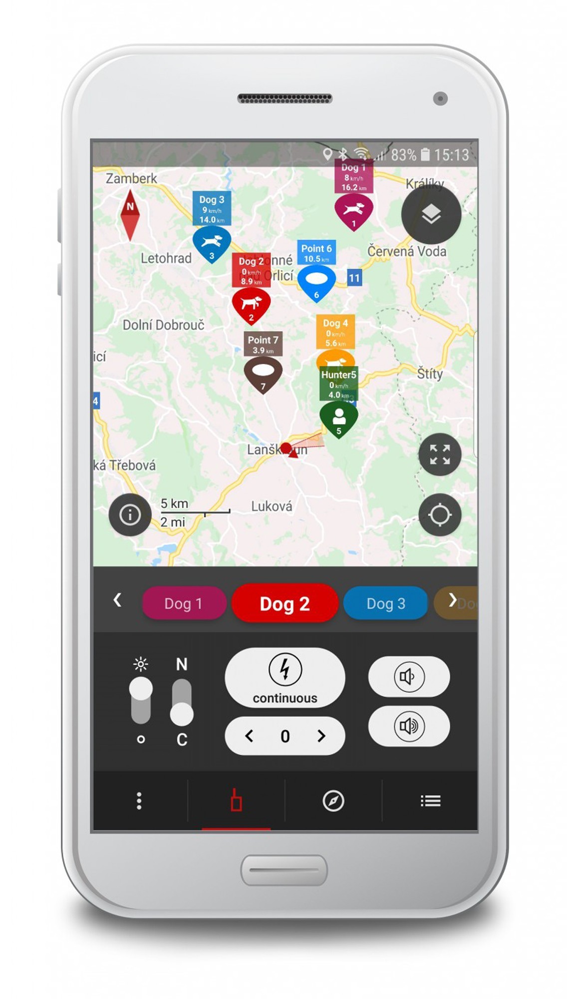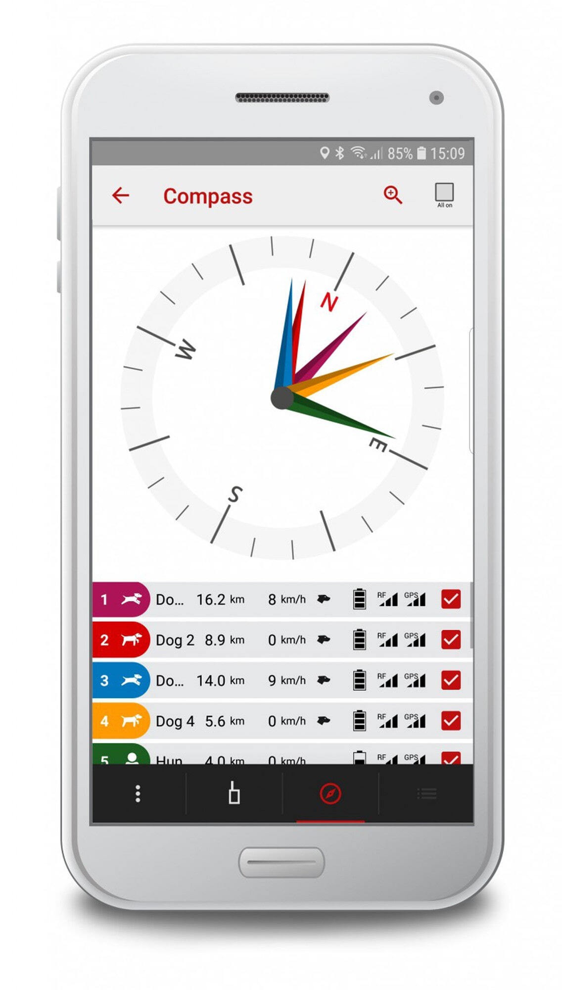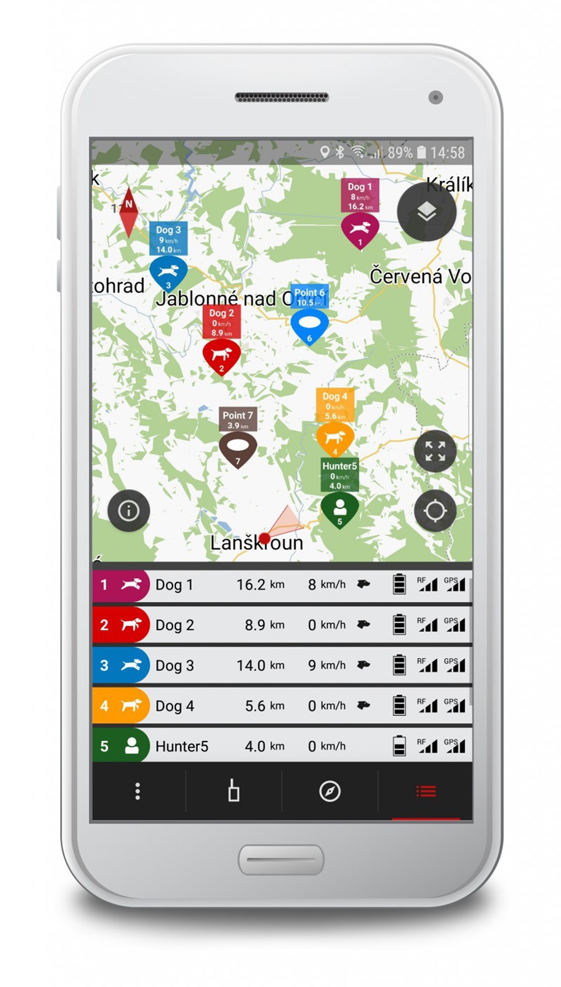 Permet de voir tous les appareils (chiens, autres gestionnaires, points de cheminement) sur la carte