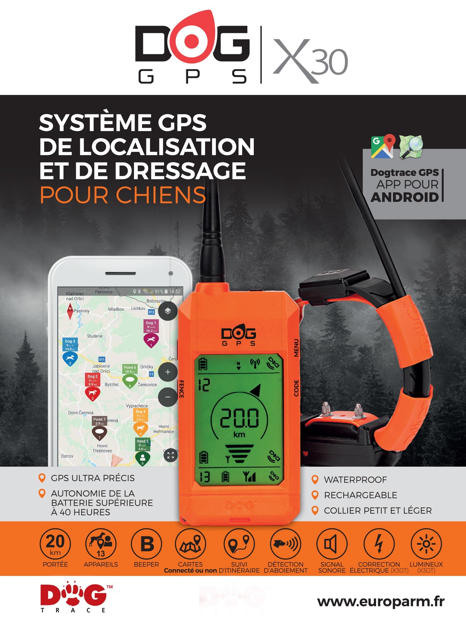 Fiche technique: Système de repérage GPS / Dressage pour chien DOGTRACE X30T - Dogtrace